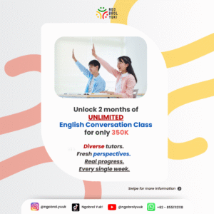 La clase privada en Ngobrol Yuk ofrece una experiencia de aprendizaje completamente adaptada a las necesidades y objetivos personales de cada participante. En esta modalidad, el horario de estudio es más flexible y puede ajustarse según el acuerdo entre el alumno y el profesor. Con un sistema uno a uno con el tutor, el estudiante recibe atención total, haciendo que el proceso de aprendizaje sea más efectivo y enfocado en los temas o habilidades que desea desarrollar. La duración de cada sesión también puede personalizarse, brindando comodidad y resultados óptimos para el participante. Esta clase es ideal para quienes buscan una experiencia de aprendizaje personalizada y flexible.